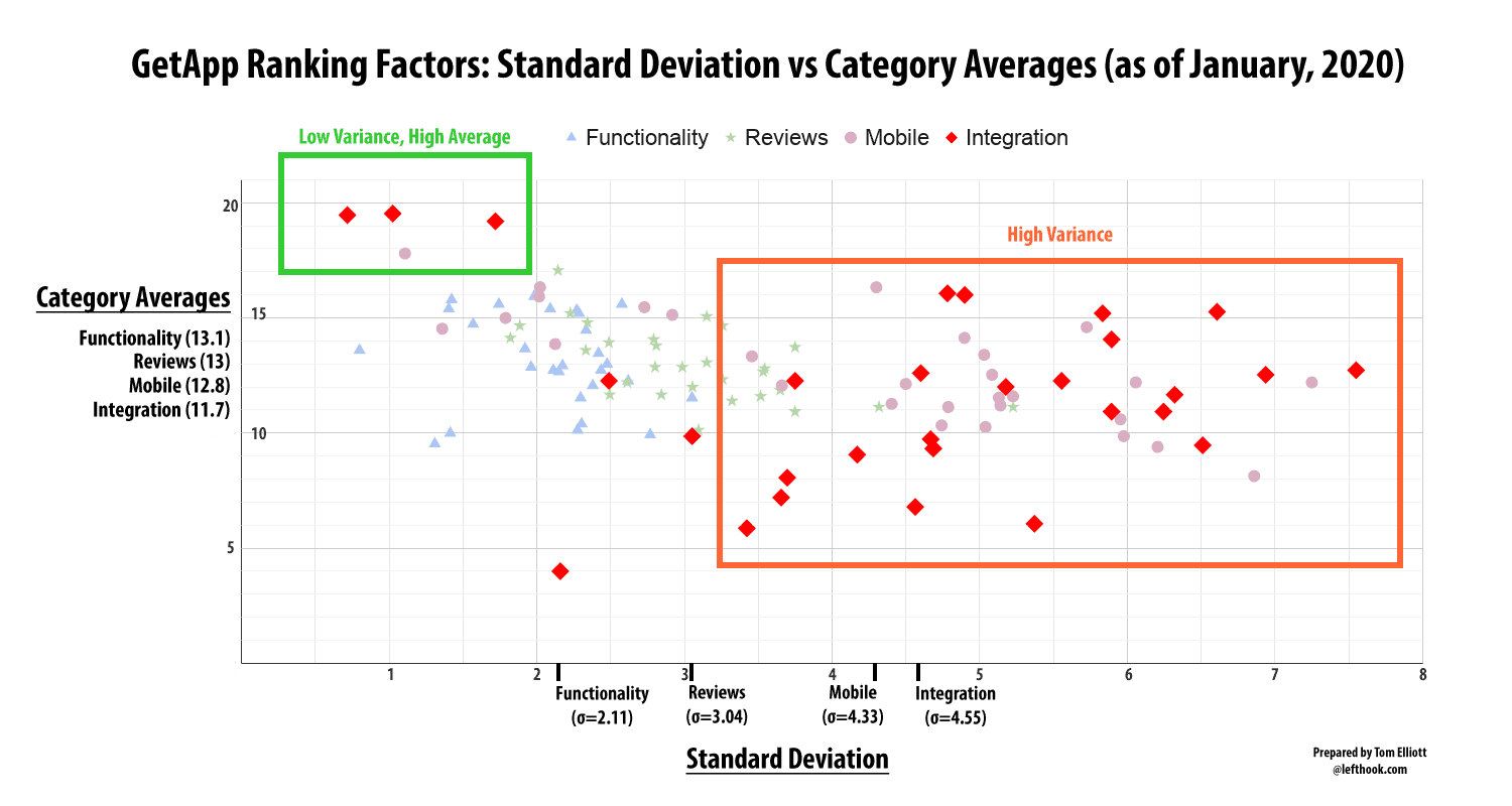 Analysis of GetApp's 2019 rankings across 29 categories, revealing high variance in integration scores as a differentiation opportunity.